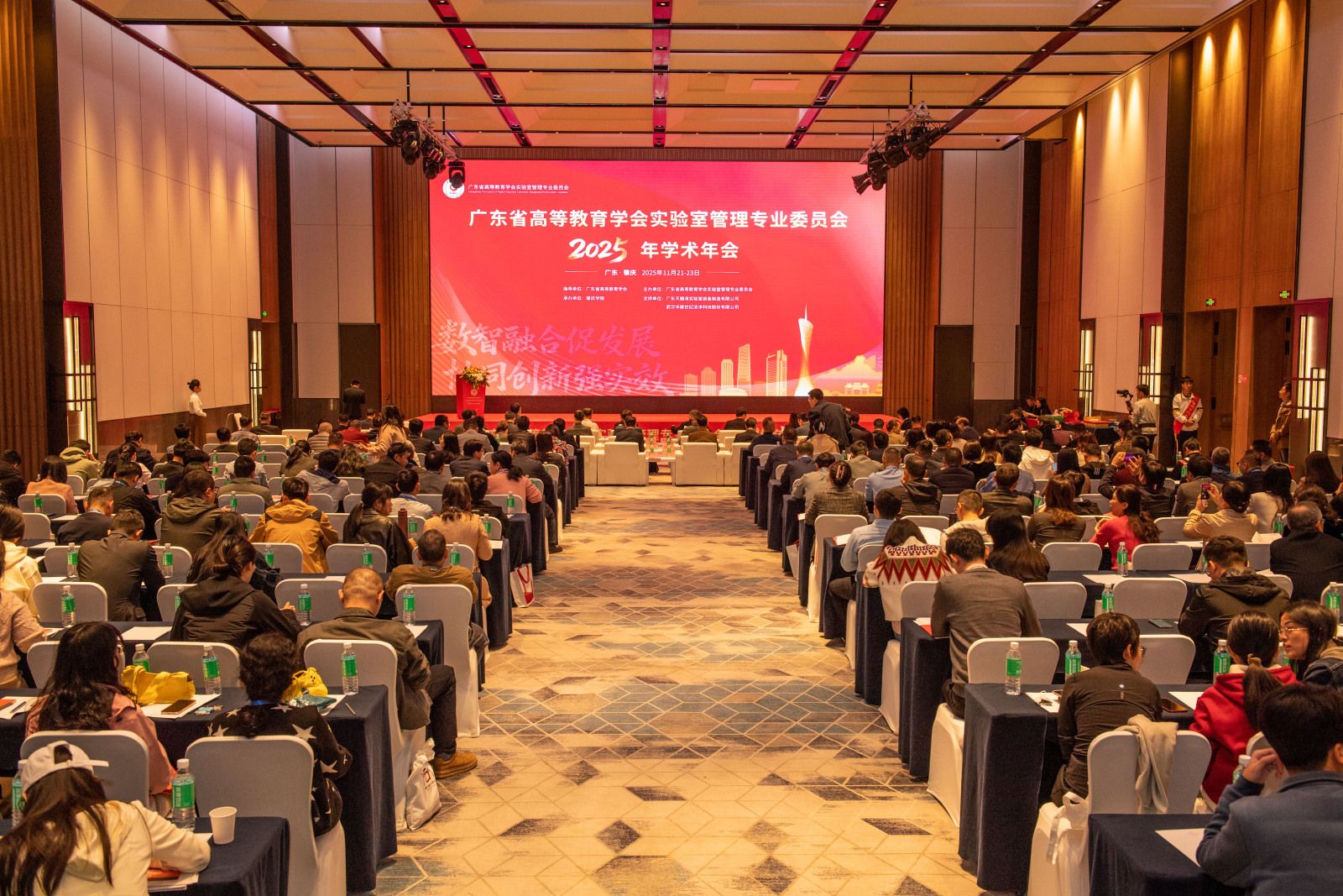 【本网讯】2025年11月21-23日,广东省高等教育学会实验室管理专业委员会2025年学术年会在我校顺利召开。本次会议由广东省高等教育学会指导、广东省高等教育学会实验室管理专业委员会(以下简称:实验室专委会)主办,肇庆学院承办,广东天赐湾实验室装备制造有限公司、武汉华康世纪洁净科技股份有限公司支持,以“数智融合促发展,协同创新强实效”为主题,搭建了一个高水平交流平台。来自粤港澳大湾区各高校的实验室管理人员、企业代表共计300余人参加会议。开幕式由实验室专委会秘书长宋小飞主持。